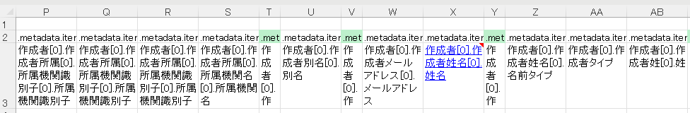 - 2行目(メタデータ項目名の内部キー)に重複した値を持つ列があると、それらのセルの背景色が赤色になります。