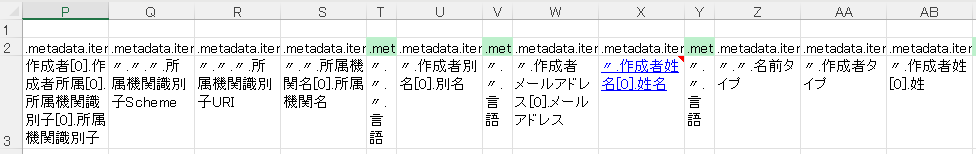 列幅3だと3行目(メタデータ項目名のラベル)が全部表示されません。2行目(メタデータ項目名の内部キー)に薄い緑色を付いているので「緑色だったら言語」と判断してください。